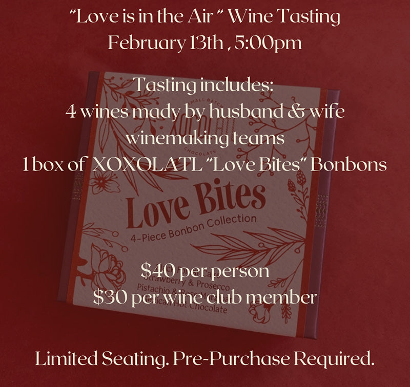 Join us on the eve of Valentine's Day for a special session our wine tasting featuring wines made by husband and wife duos, with a sweet takeaway! We love featuring XOXOLATL chocolates, and this year we are debuting an all-new product they've launched just in time for Valentine's Day.